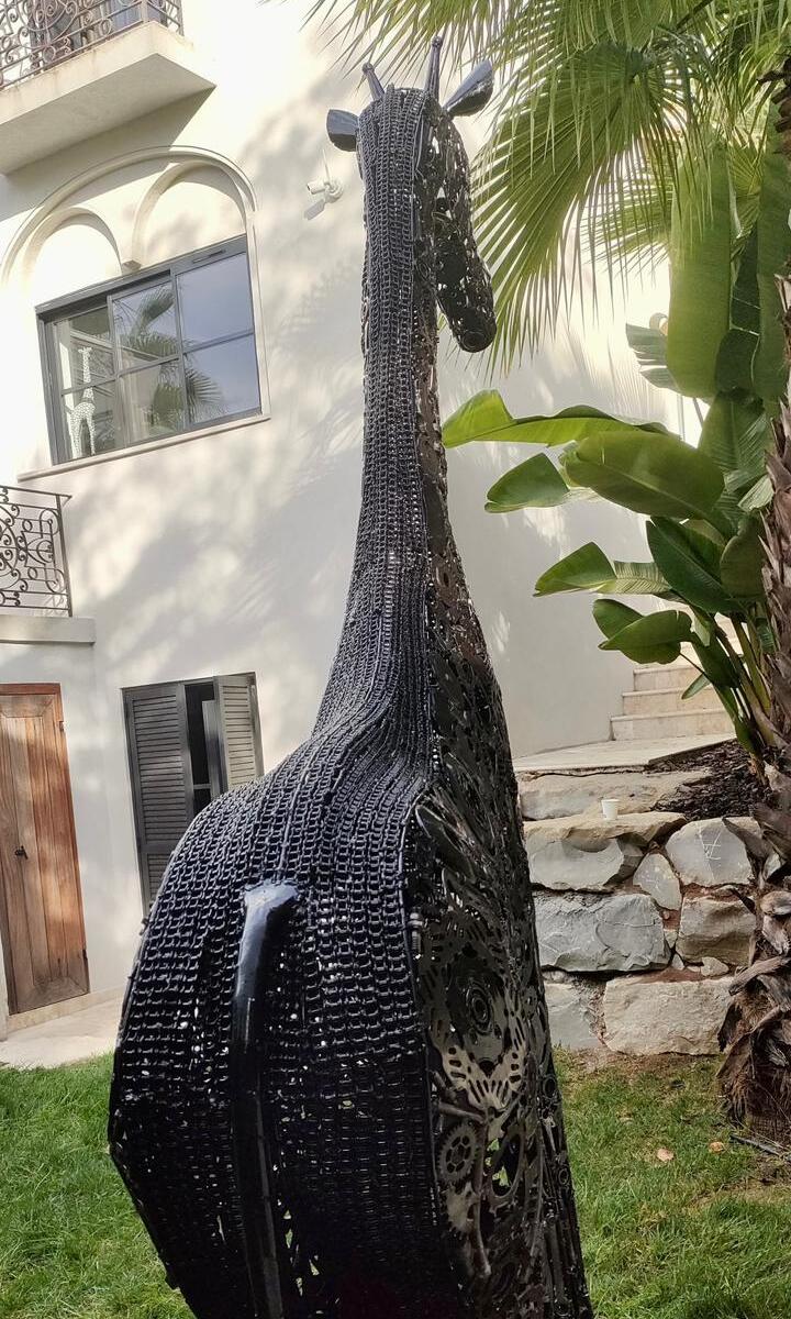 Sublimez votre espace avec La Girafe Mécanique, une sculpture monumentale en métal recyclé de 2,80 mètres de haut.