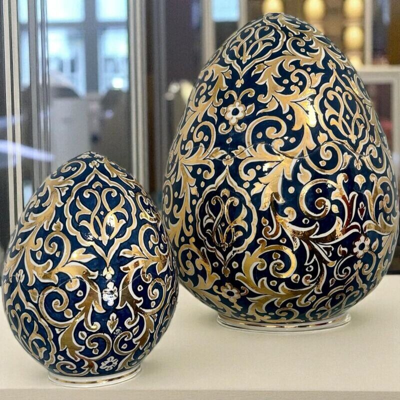 Posé sur une console, une table basse ou dans une vitrine, l’Œuf Céramique Bleu Impérial attire immédiatement le regard. Ses arabesques dorées reflètent la lumière et contrastent avec le bleu profond, donnant une impression de majesté et de noblesse.