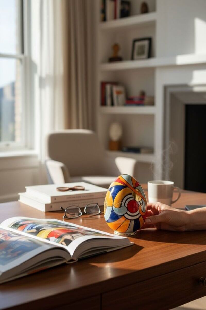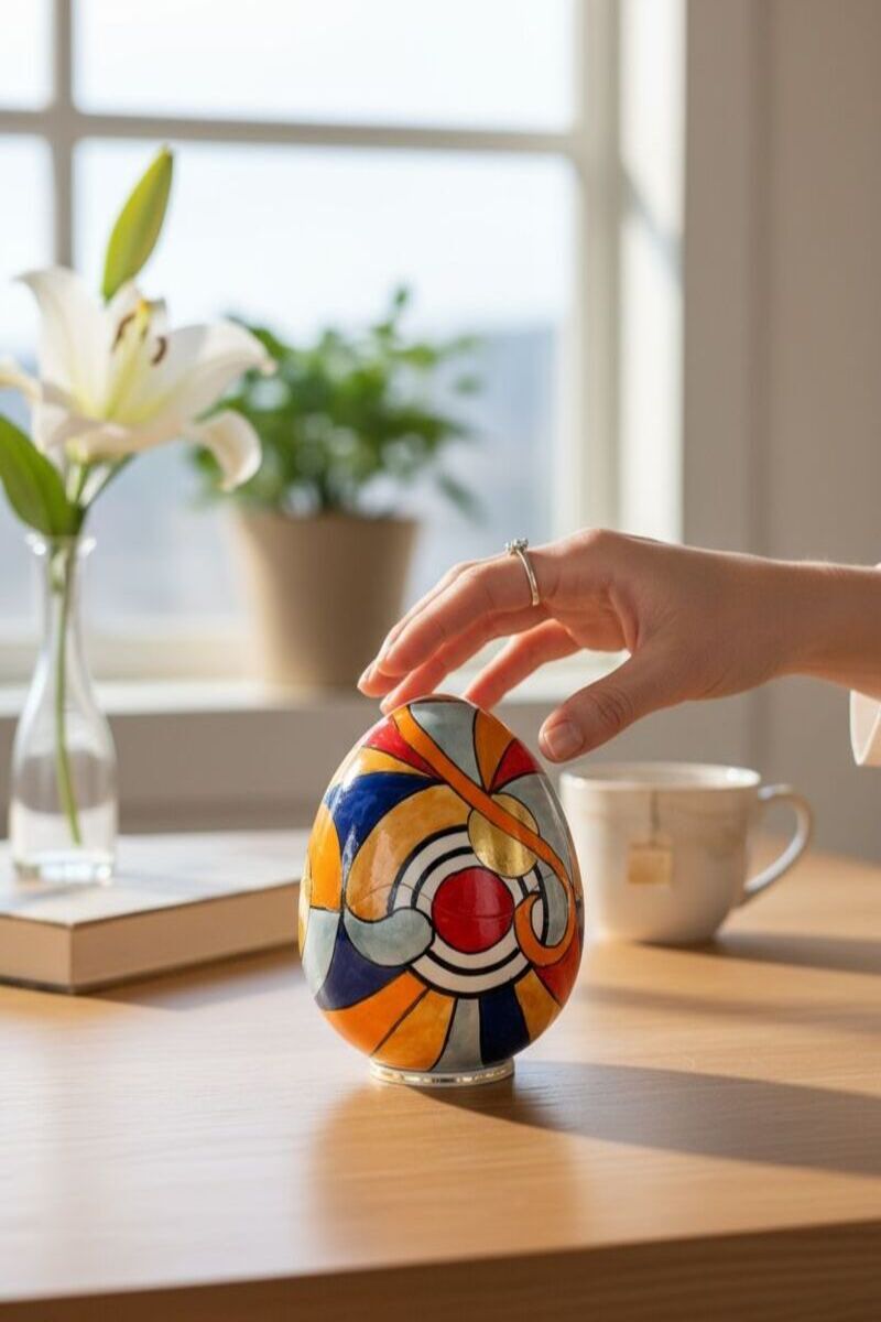 Avec son décor géométrique et multicolore, ponctué de touches dorées appliquées manuellement, chaque œuf reflète l’esprit libre et créatif de Picasso. Les contrastes entre les teintes rouge, orange, bleu, rose et or apportent une énergie vibrante, idéale pour dynamiser un salon, une bibliothèque ou même une vitrine.